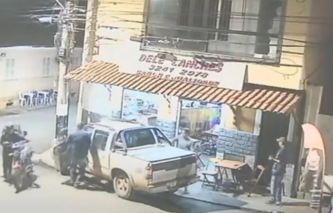 Câmeras de segurança registraram o momento em que a caminhonete, estacionada ao lado do professor, se movimenta repentinamente, sobe na calçada e o atinge. Márcio estava sentado em uma cadeira quando foi prensado contra a parede.