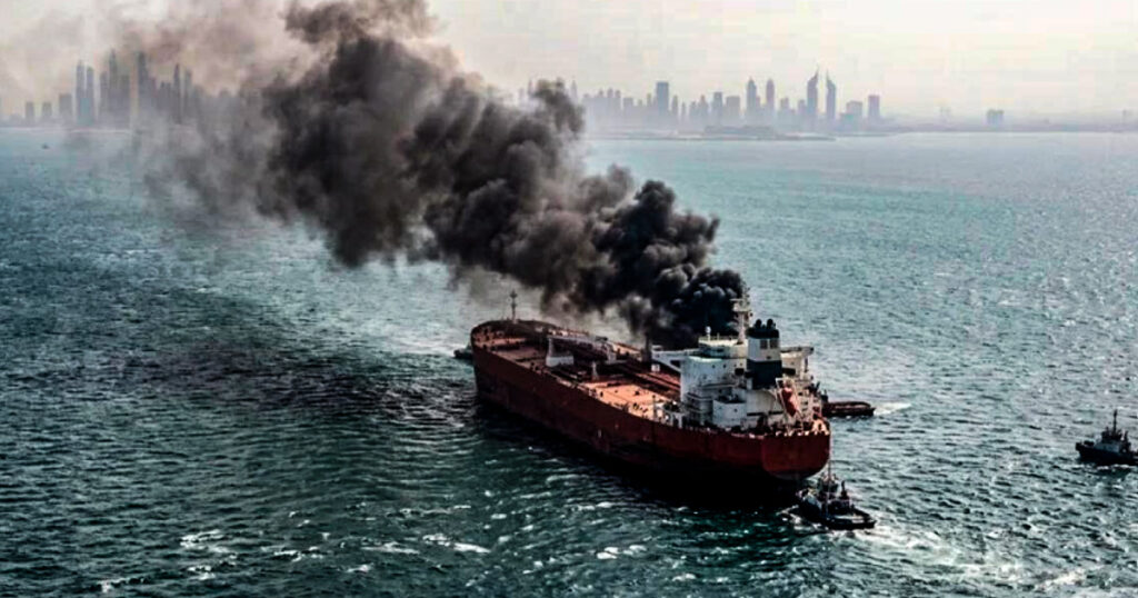 Autoridades de Dubai disseram que o incêndio no Al-Salmi, de bandeira do Kuwait, foi controlado após um ataque de drones, sem vazamento de óleo e sem ferimentos na tripulação. A Kuweit Petroleum Corp, proprietária do navio, afirmou que o casco da embarcação foi danificado.