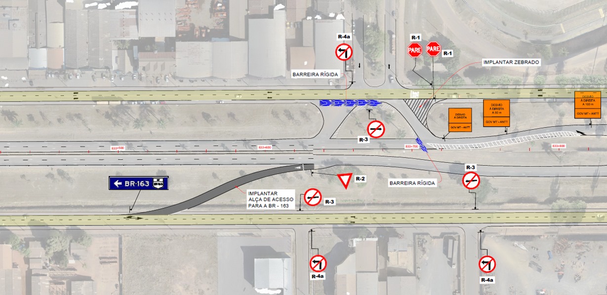 Foi construída uma alça provisória no km 833,5 da BR-163, próximo ao Gigante do Norte para possibilitar o acesso de retorno ao eixo principal da BR-163.
