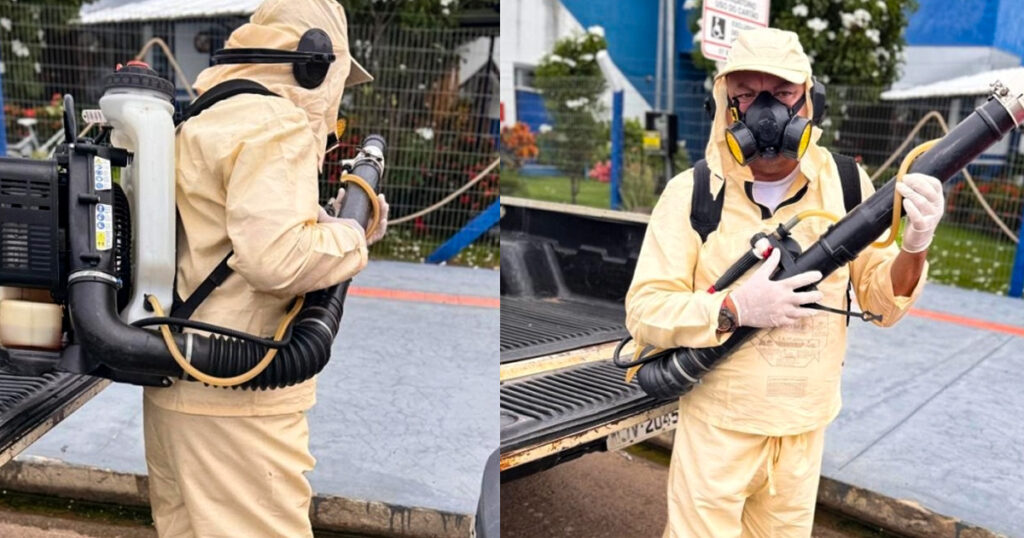 “Porque o inseticida é aplicado com aquela bomba costal motorizada, e essa bomba fragmenta o líquido do inseticida de uma forma que ele vira micropartículas no ar. Então, se estiver ventando, se tiver um sol muito forte ou estiver chovendo, não tem como aplicar, e a durabilidade dele no ambiente é de apenas duas horas. Então tem que ser uma ação bem precisa mesmo, para não haver desperdício. É feito no comecinho da manhã, ali cinco e meia, seis horas da manhã já tem equipe na rua aplicando o inseticida, porque é o melhor horário”, explicou.
