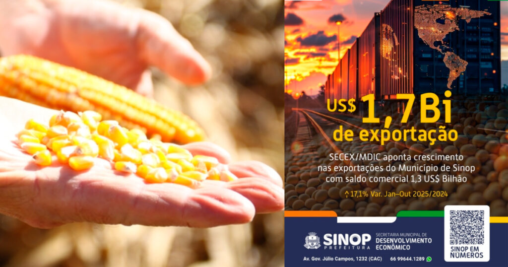 O município de Sinop registrou um acréscimo de 17,1% nas exportações no ano de 2025. Entre janeiro e novembro deste ano, a cidade registrou US$ 1,7 bilhão em exportações e acumulou um saldo comercial de aproximadamente US$ 1,3 bilhão. No mesmo período do ano passado, as vendas das produções foram de US$ 1,5 bilhão. Os dados são disponibilizados em tempo real pela Secretaria de Comércio Exterior (Secex) e pelo Ministério do Desenvolvimento, Indústria, Comércio e Serviços (MDIC).
